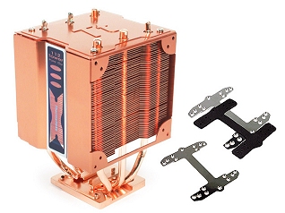 An Material wurde bei dem "Heatpipe 4 in 1" High-End Kühlkörper wahrlich nicht gespart: Der Kupferkühlkörper ist extrem großzügig dimensioniert (92 x 81 x 145,5 mm). Insgesamt besitzt der Kühlkörper 59 großflächige Kupfer-Lamellen. Diese werden von einem kupferfarbenen Aluminiumrahmen eingefasst. An der Kupferplatte des Kühlers befinden sich sechs kupferne Heatpipes, welche die aufgenommene Wärme über die Kühlrippen an die Umgebungsluft ableiten. Um den Kühler sicher befestigen zu können, werden entsprechende Backplates mitgeliefert, die eine sichere Montage des Kühlers auf den jeweiligen Prozessortypen gewährleisten.