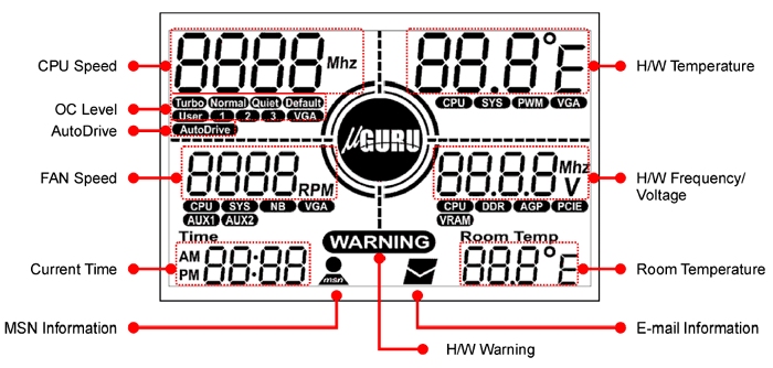 Die Funktionen der GuruClock kann man rechts aus dem Bild ablesen. Der besondere Vorteil ist aber das man während des Betriebes, in einem Spiel oder so, wo Leistung benötigt wird,das System einfach per Knopfdruck übertakten kann.